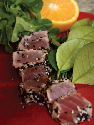 - Atum com crosta de sésamo: passa os bifes por sementes de sésamo (brancas e/ou pretas) depois de pincelar com azeite e um toque de molho de soja. Cozinha no tempo “mal passado” para ficar suculento.